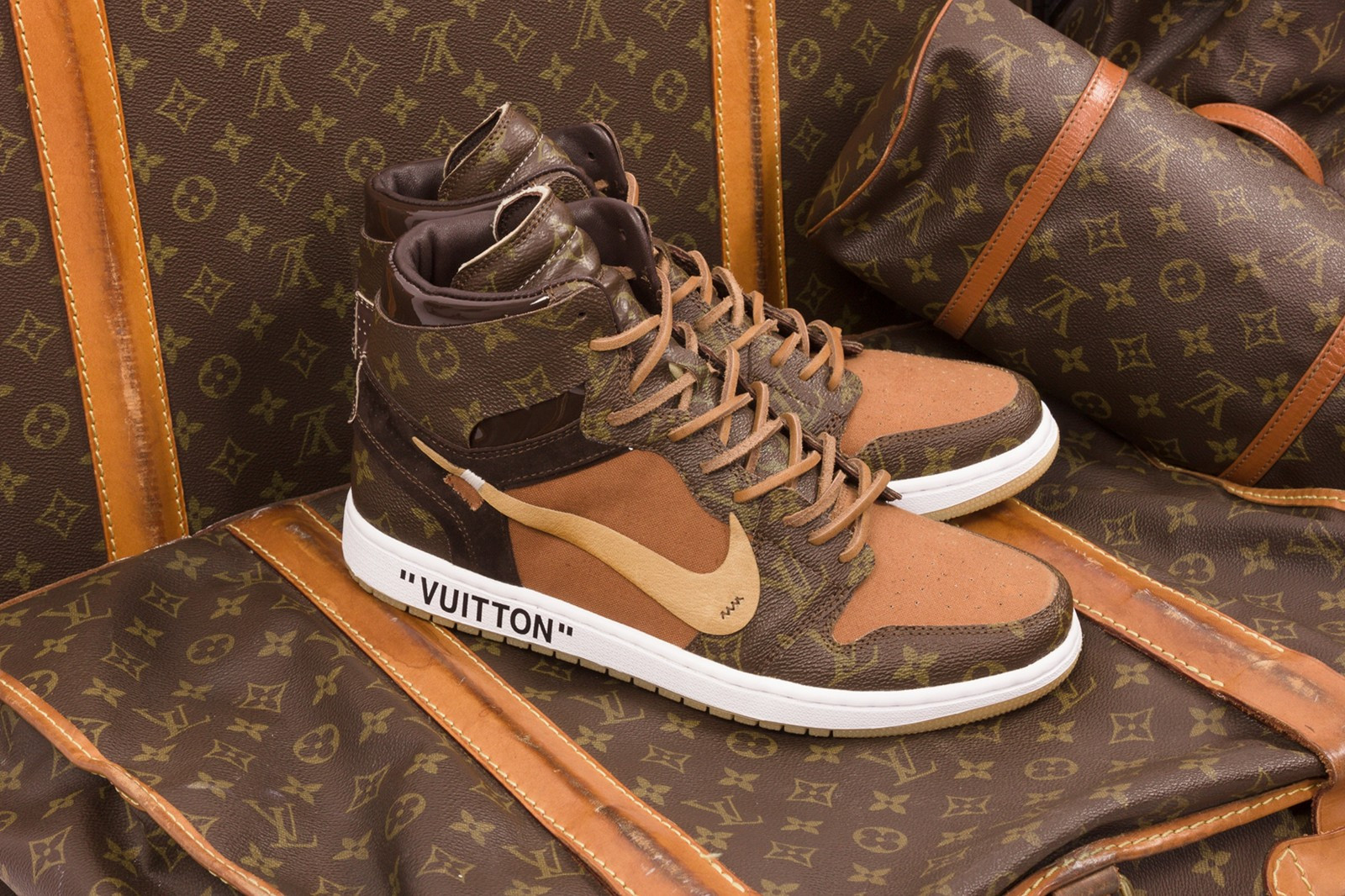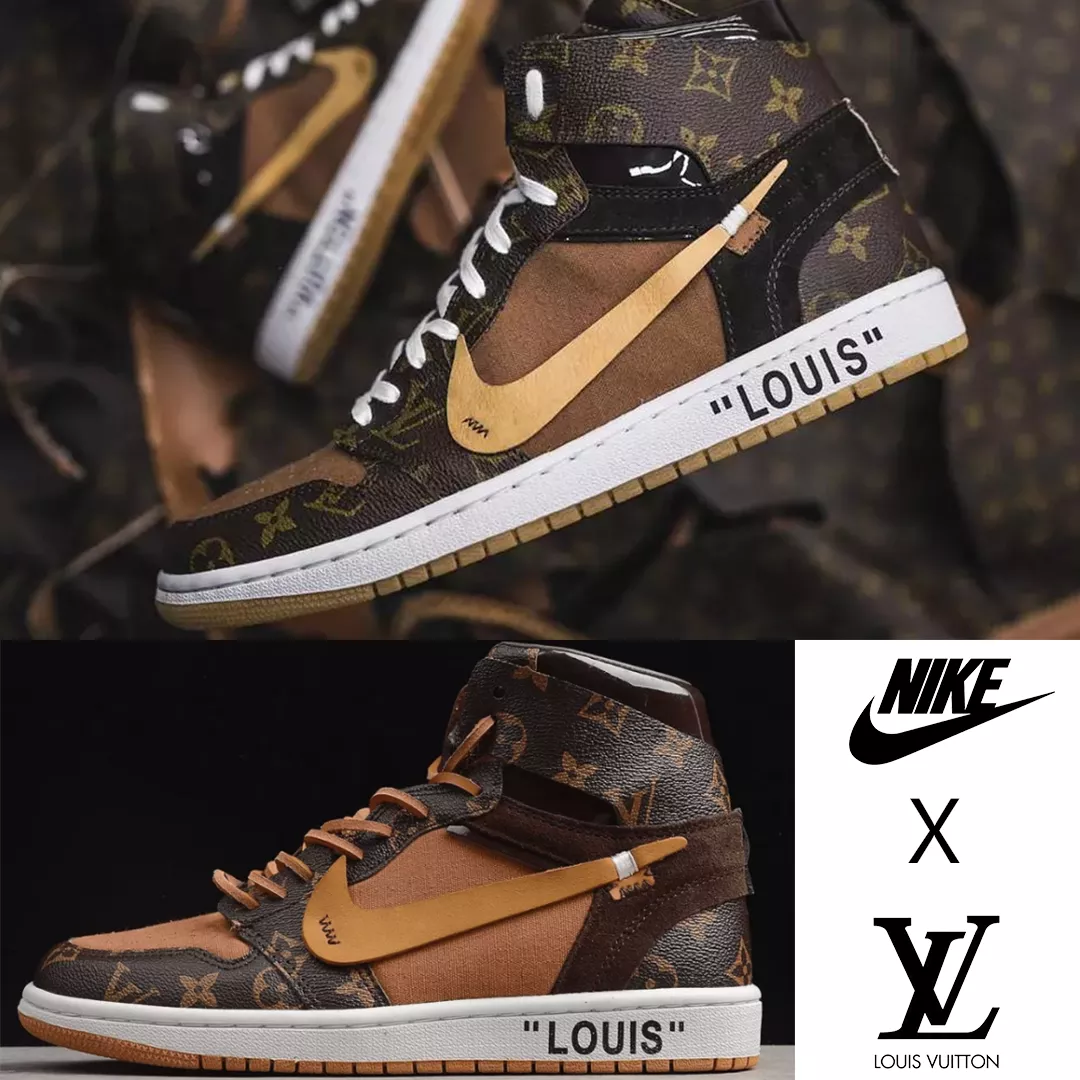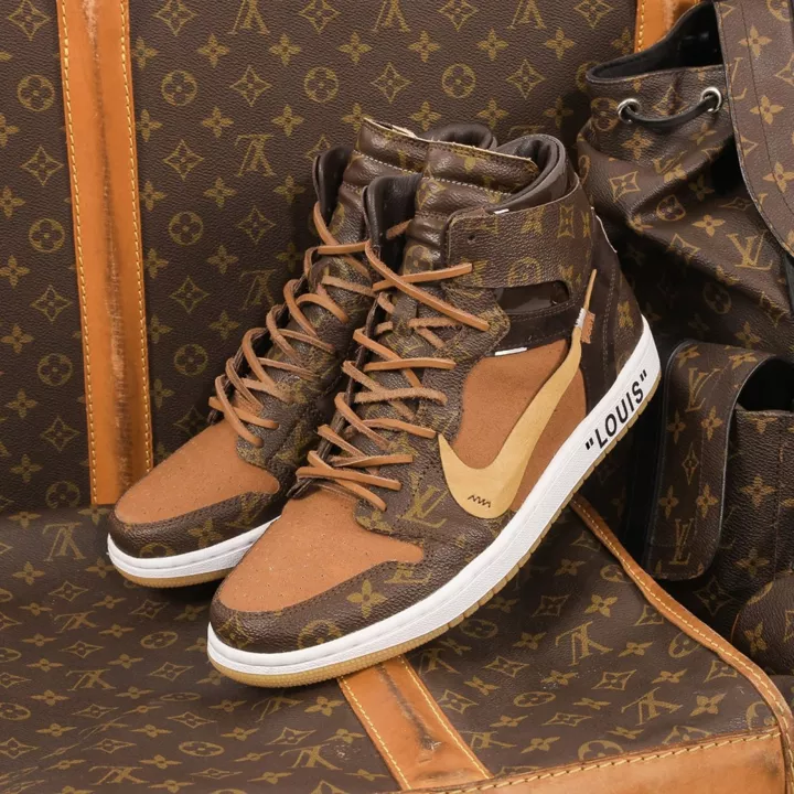 このスニーカーは全体的な形にクラシックなAir Jordan 1のデザインを使用していますが、配色と模様の上に強烈なLouis Vuittonの特色があります。靴の全体の色はルイヴィトンの定番柄とブラウンの革を引き立てています。靴の内側にはOff-Leouisfor CEEZEという文字も見られます。スニーカーの外側の靴底の後ろに大きな「Louis Vuitton」という文字が印刷されています。LVブランドに敬意を表し、贅沢を尽くしています。