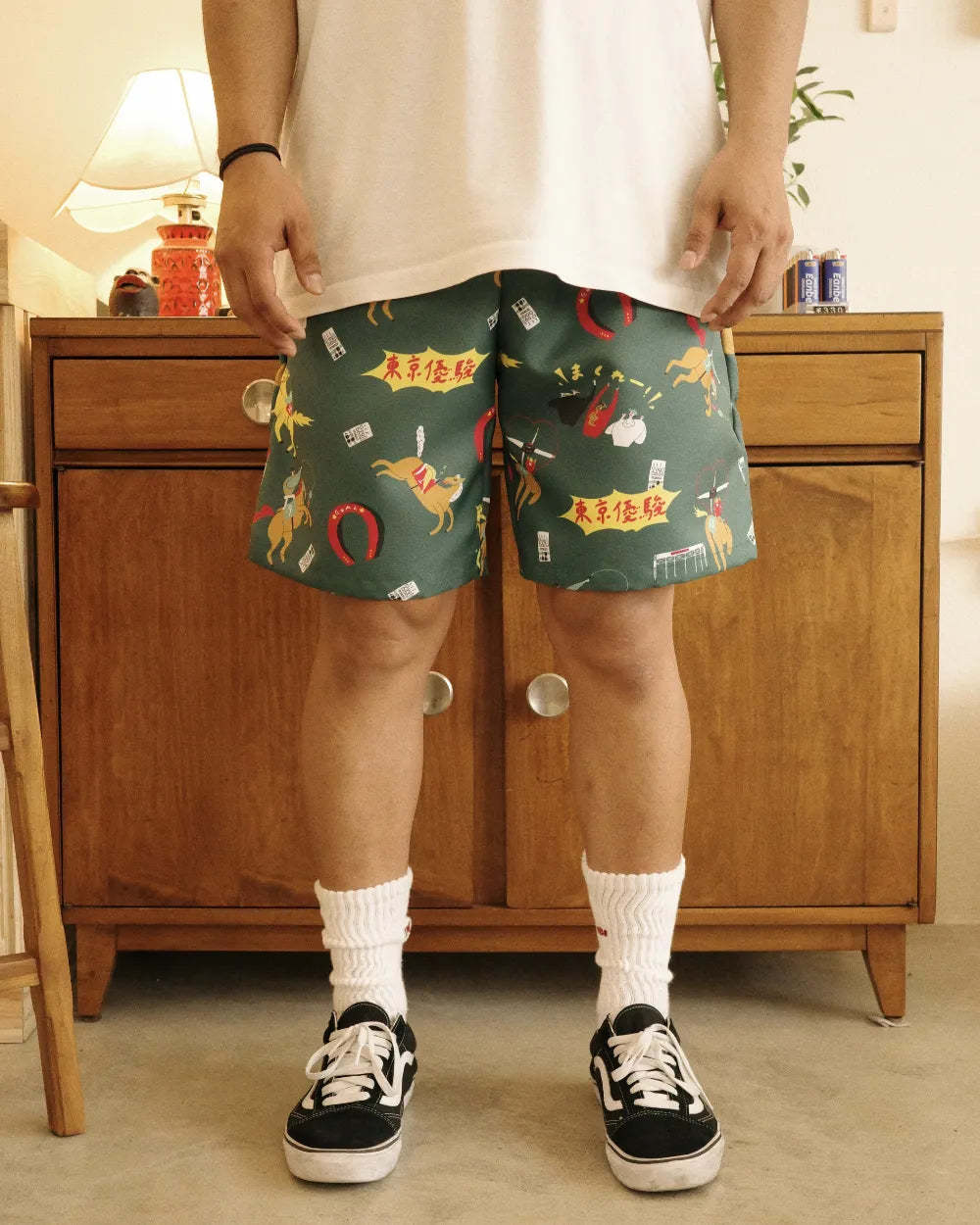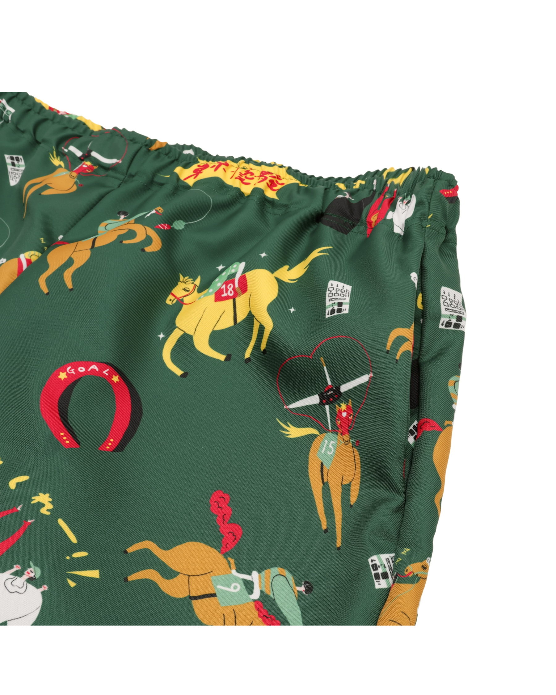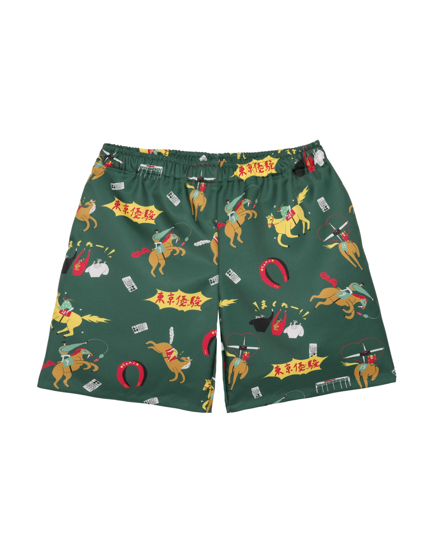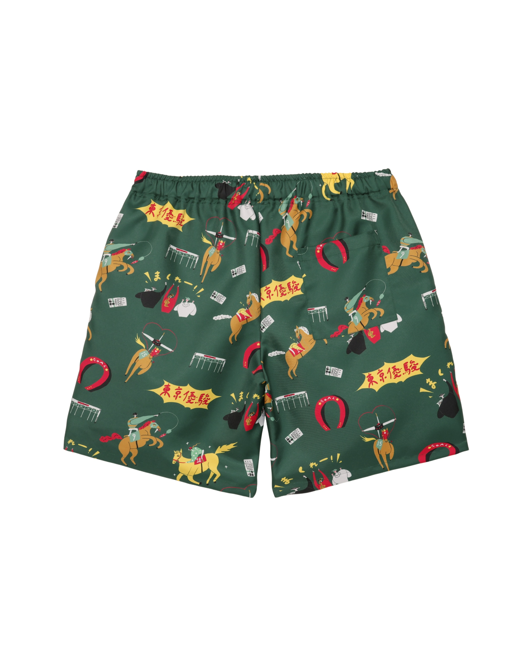 「競馬」をテーマに、ポップにデフォルメされた騎手と競走馬を散りばめた総柄のアロハシャツ「DARK HORSE」のデザインを使用したショートパンツ。