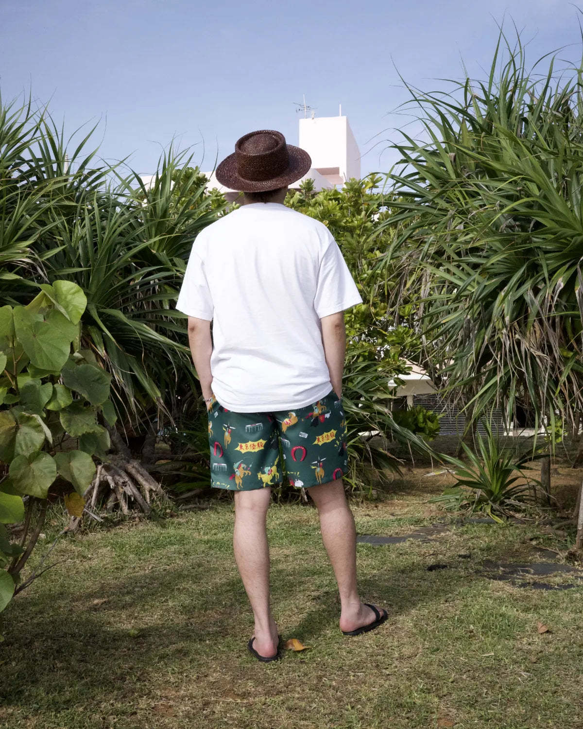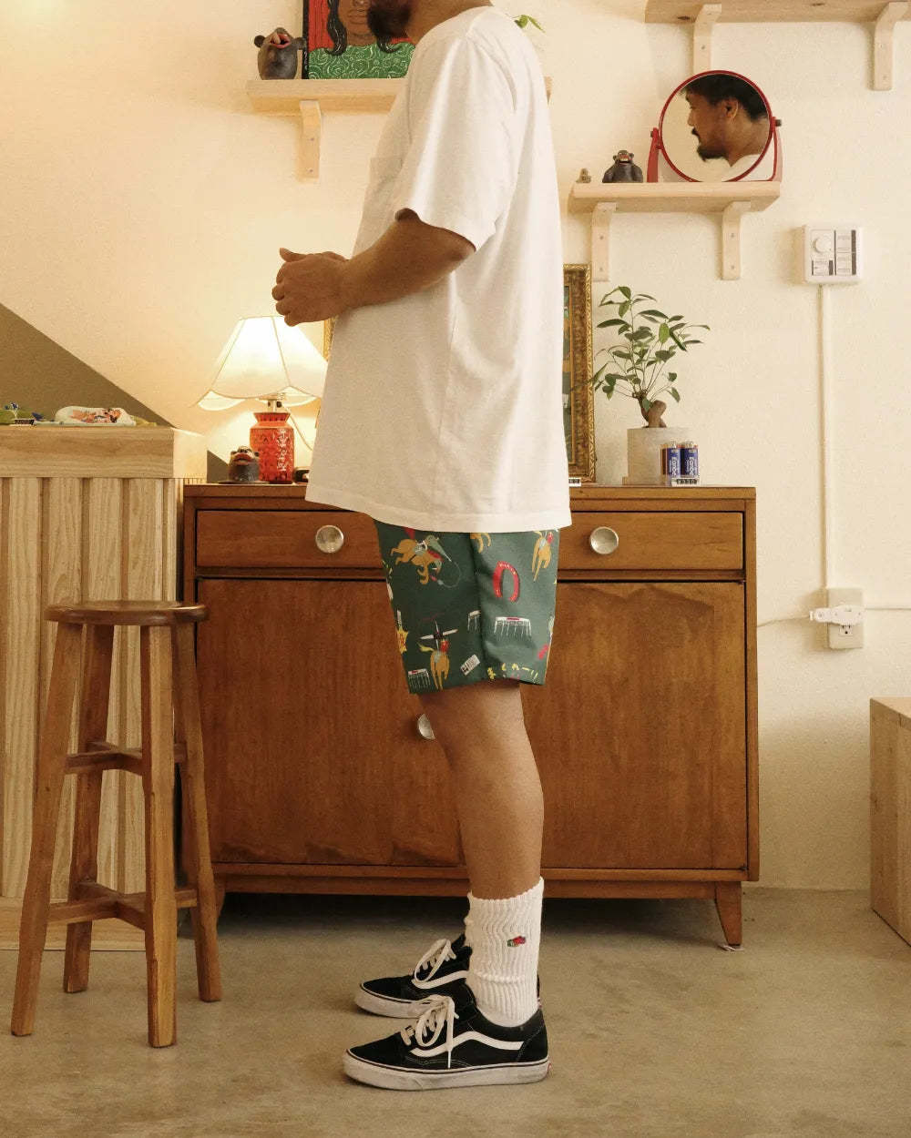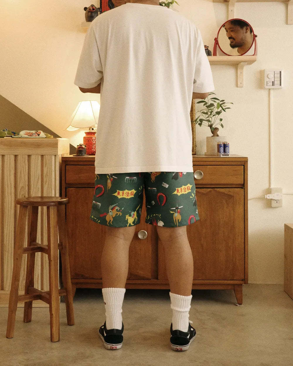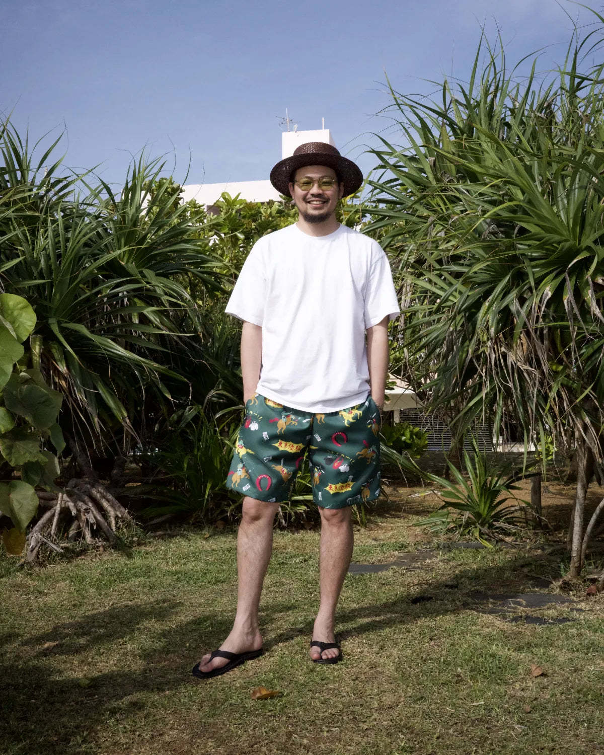 「競馬」をテーマに、ポップにデフォルメされた騎手と競走馬を散りばめた総柄のアロハシャツ「DARK HORSE」のデザインを使用したショートパンツ。