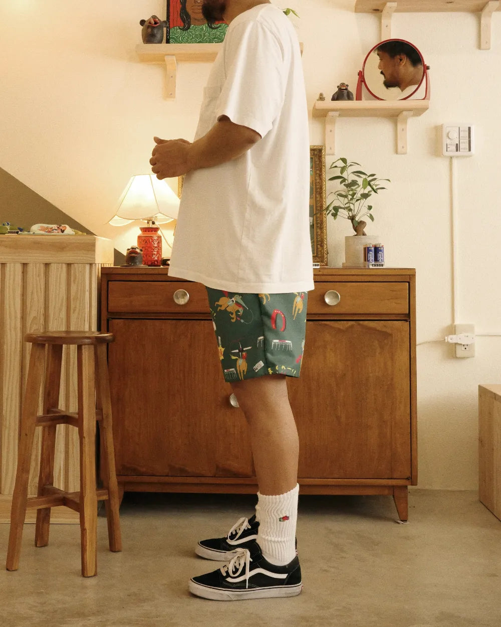 定番の白Tや無地のシャツ、ワンポイントのロゴTなど、ポップな柄とカラーリングが映えるシンプルなトップスと合わせるのがおすすめです。