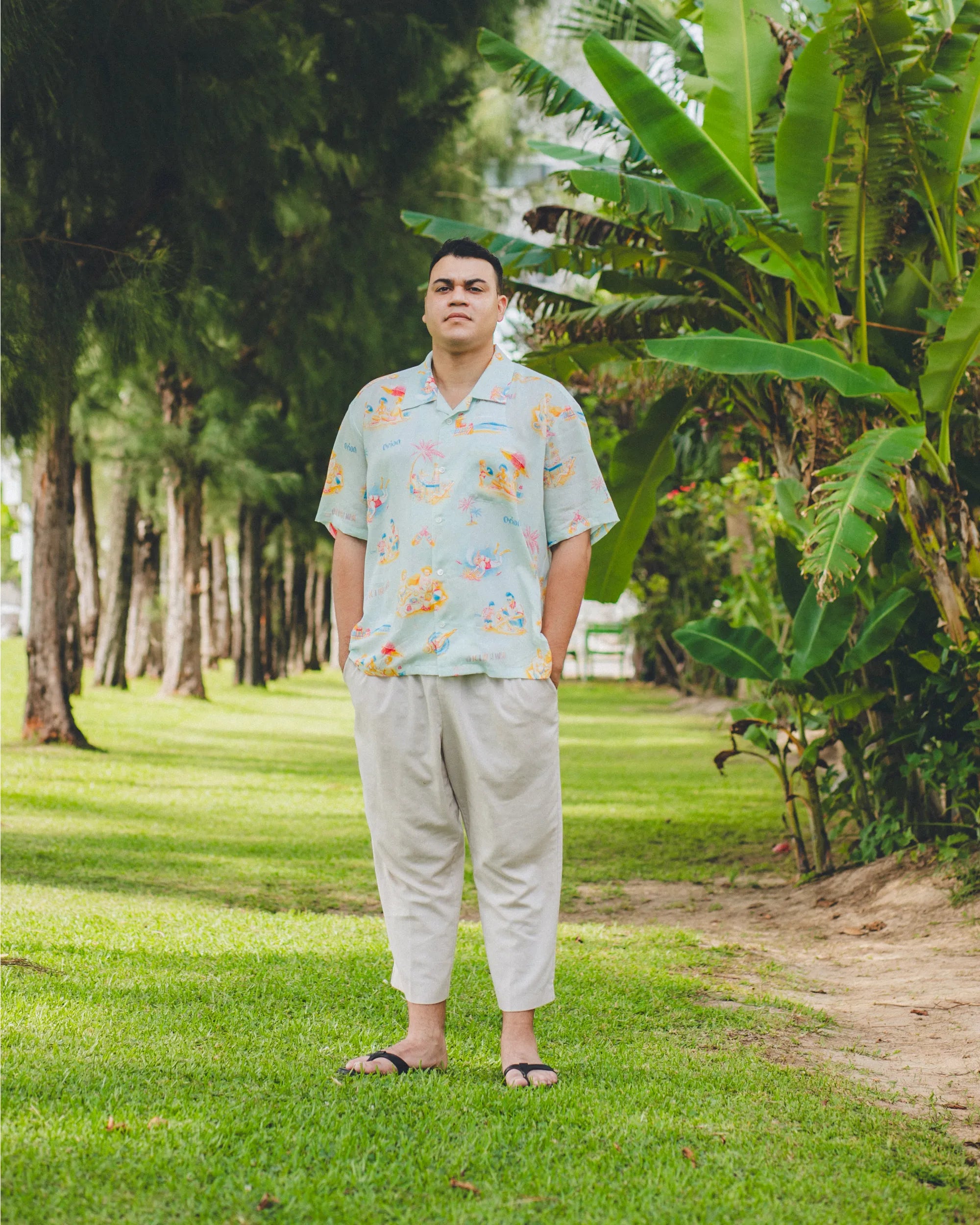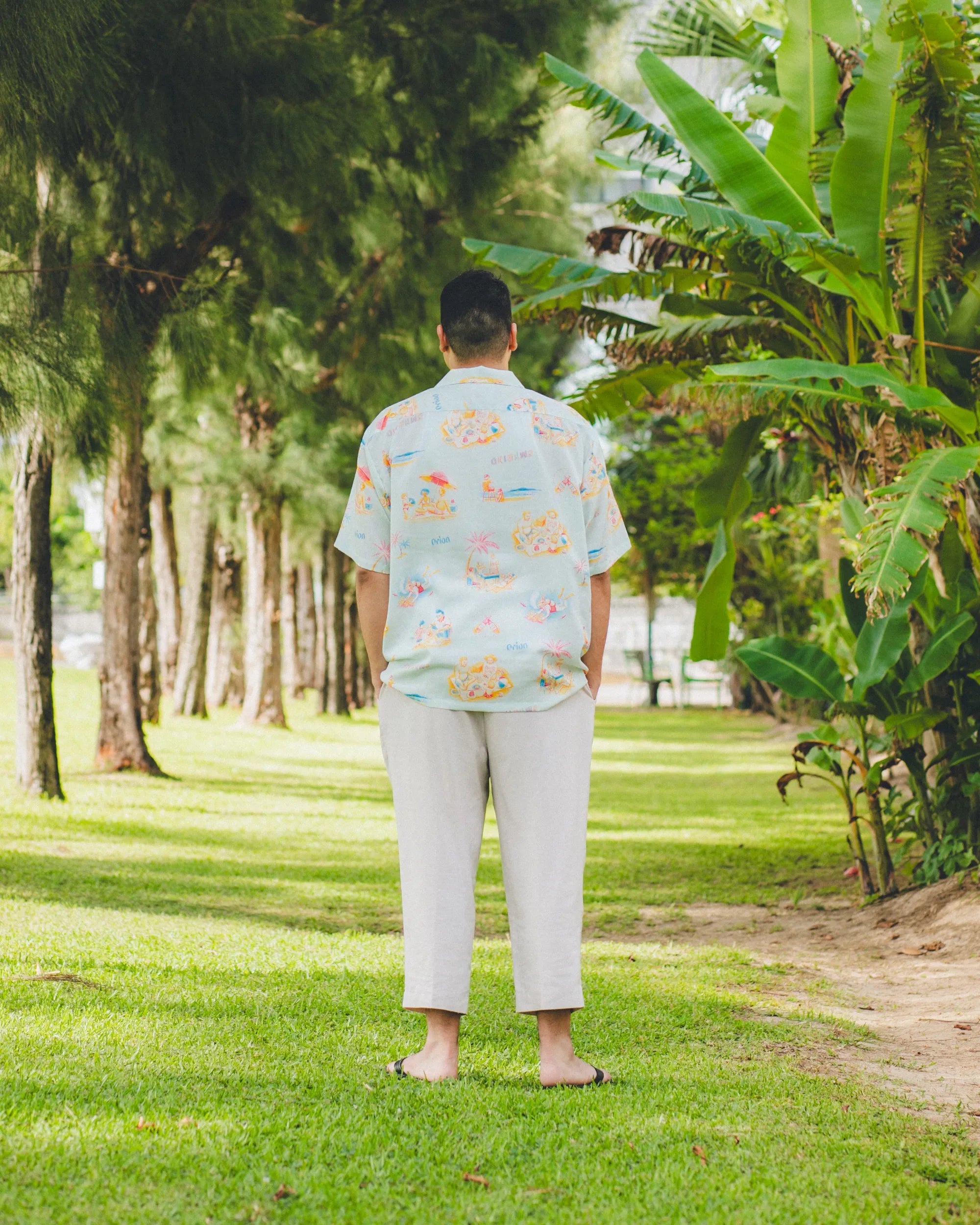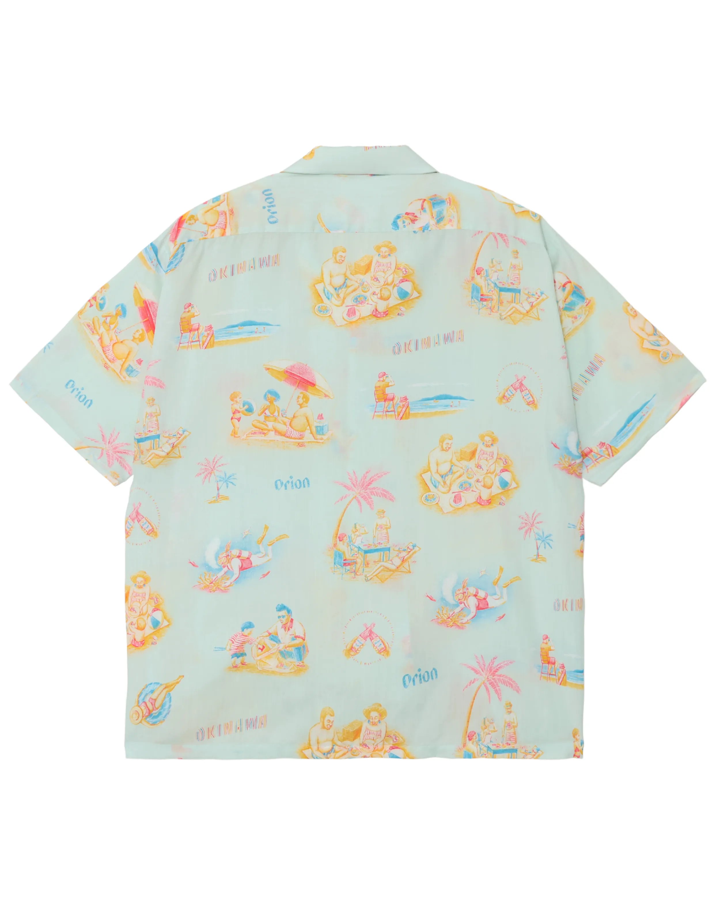 「沖縄のビーチ」をテーマに、海で遊ぶ人&海を守る人をビンテージ調の優しいタッチで描いた総柄のアロハシャツ。アートワークを担当したのはイラストレーター・ふるかわえみり氏。