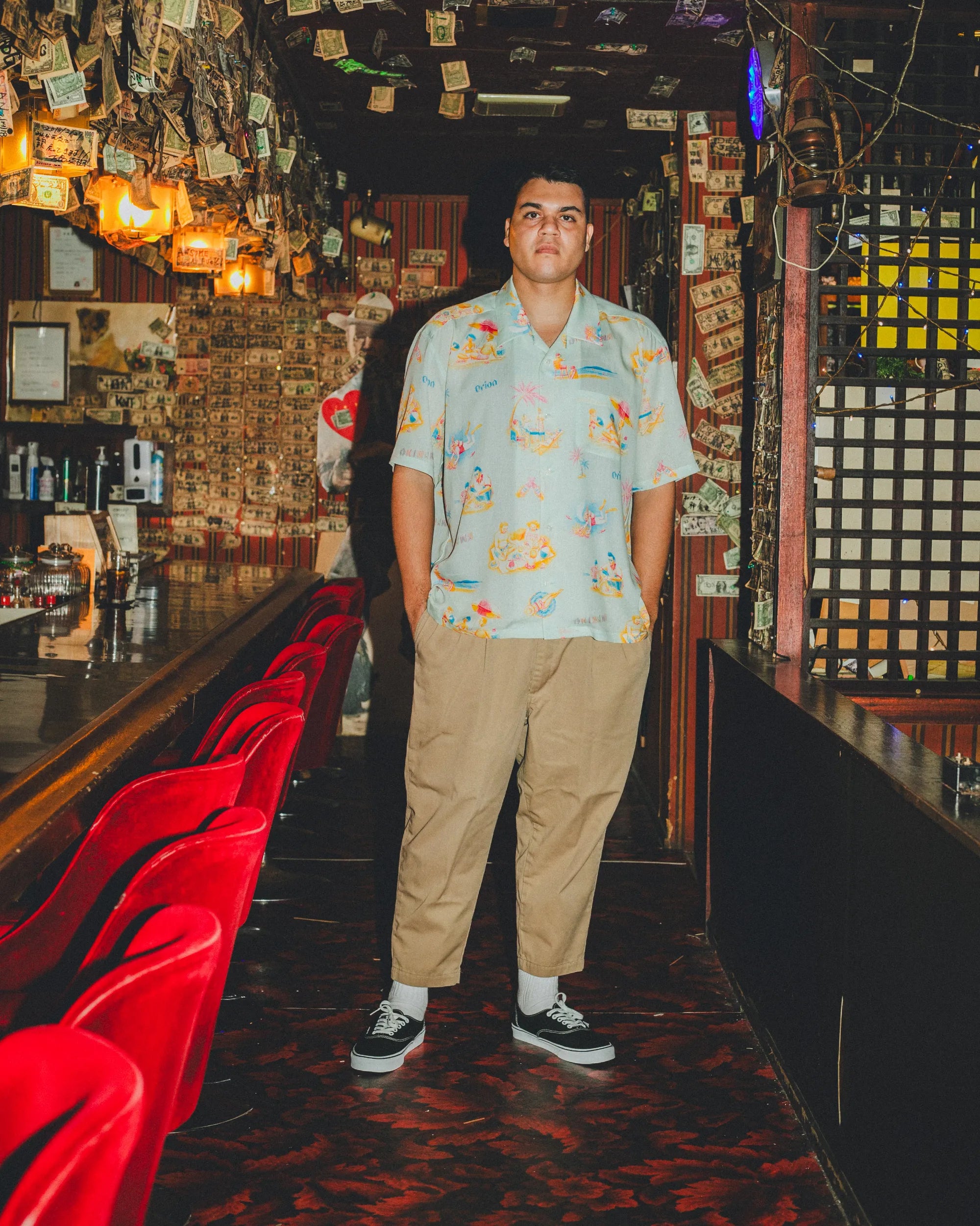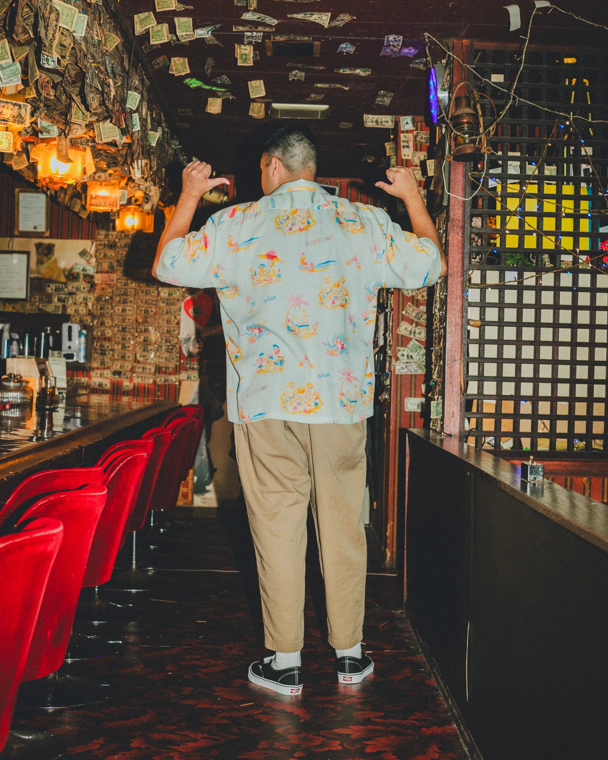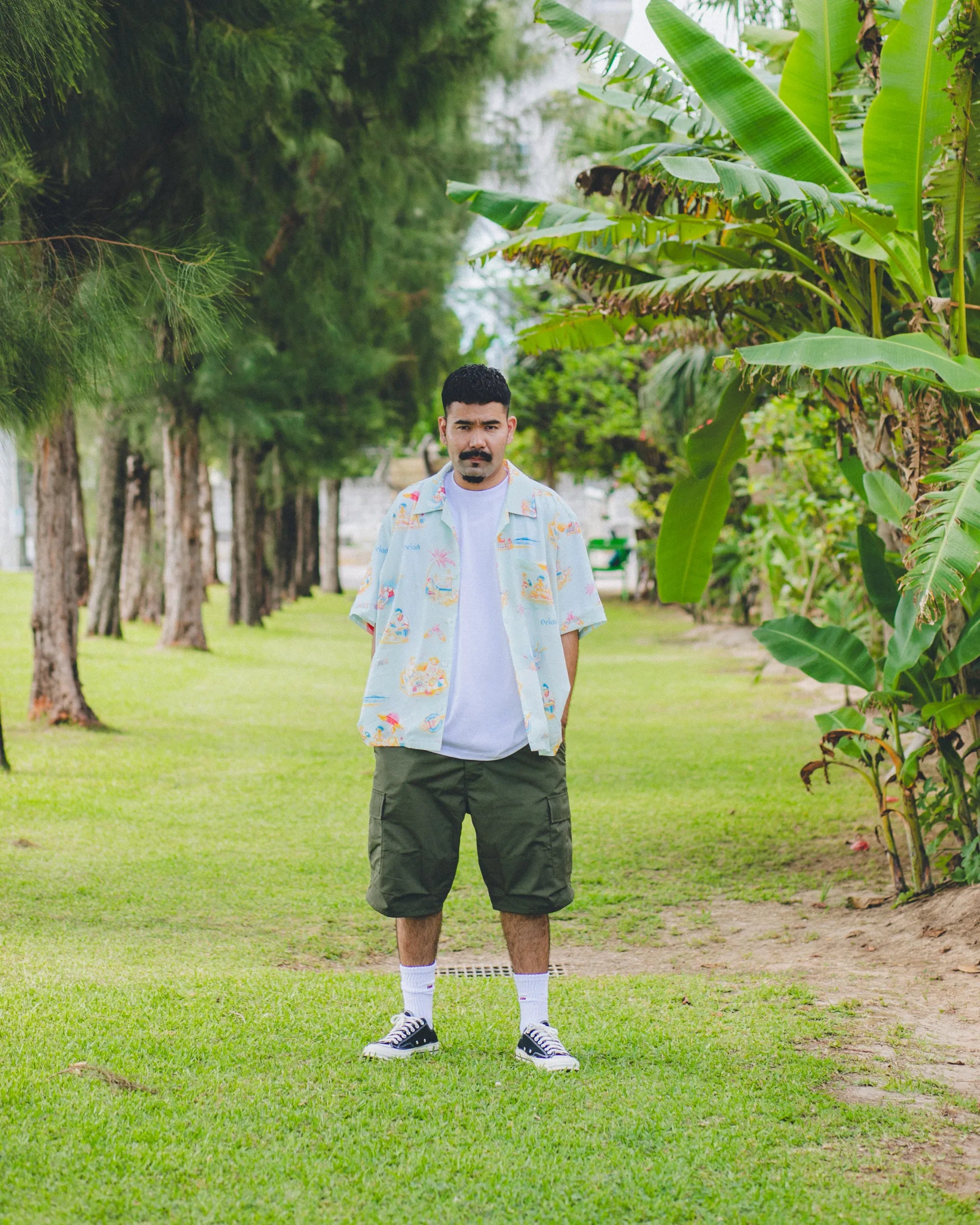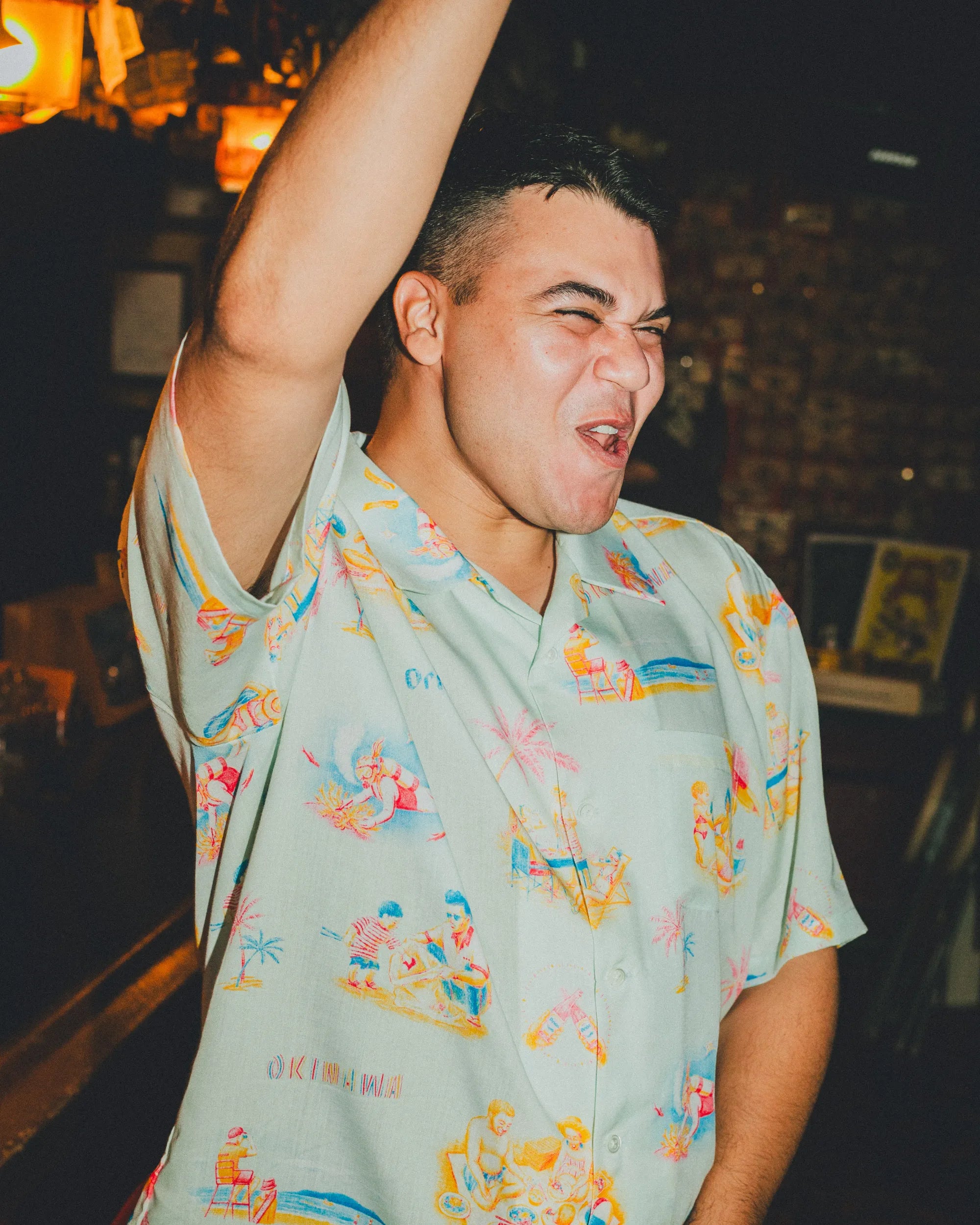 「沖縄のビーチ」をテーマに、海で遊ぶ人&海を守る人をビンテージ調の優しいタッチで描いた総柄のアロハシャツ。アートワークを担当したのはイラストレーター・ふるかわえみり氏。