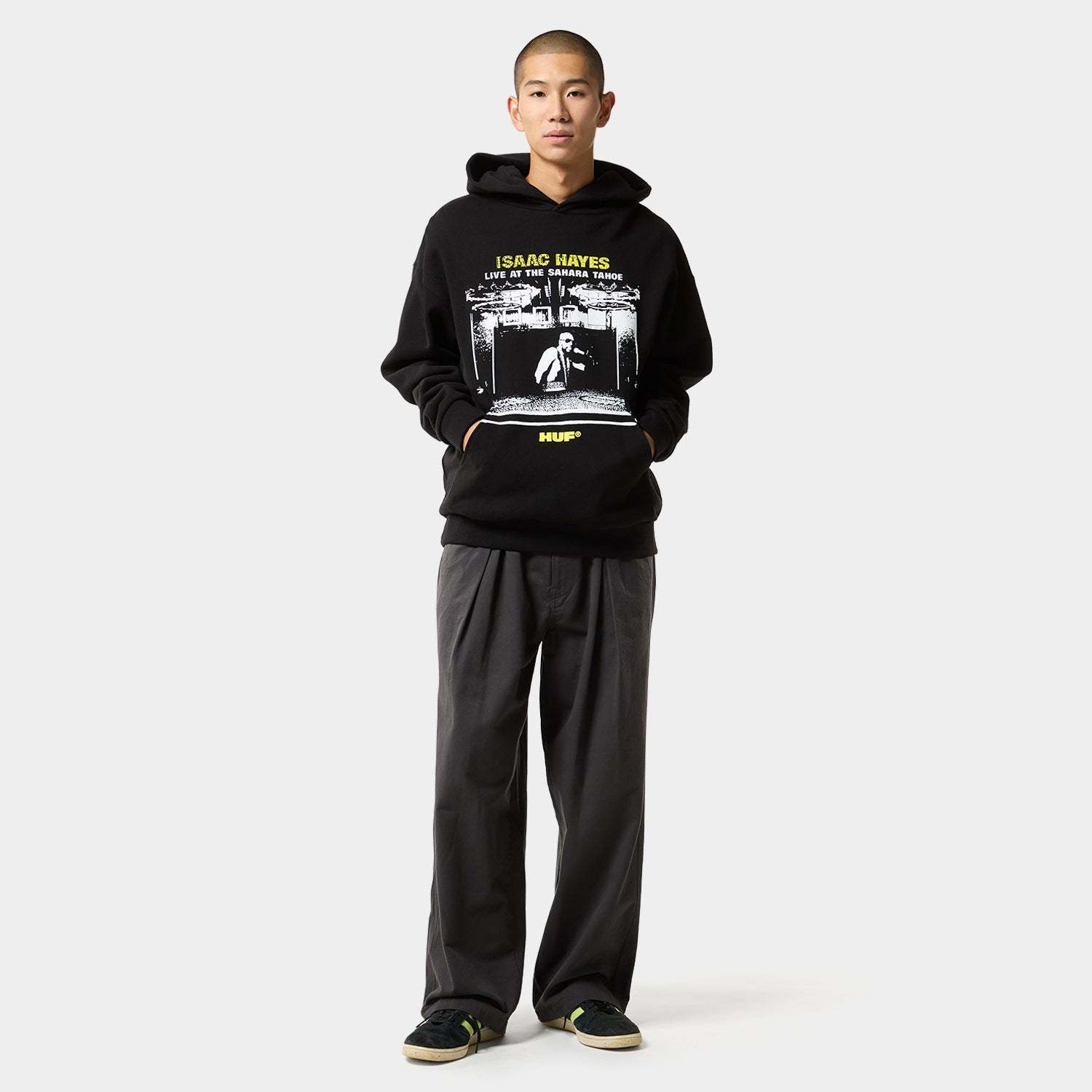 HUF Isaac Hayes カプセルコレクションでは、すべてが名曲かつオリジナルである彼の代表的アルバム『Black Moses』『Live at the Sahara Tahoe』『Hot Buttered Soul』のアートワークを採用。ヘビーウェイトのカットソーやフーディー、エンジニアードニットに刺繍を施した特別仕様のセーターなど、Isaac Hayes の革新的なソングライティングとアートビジョンを HUF の視点で再構築・再解釈したラインナップとなります。