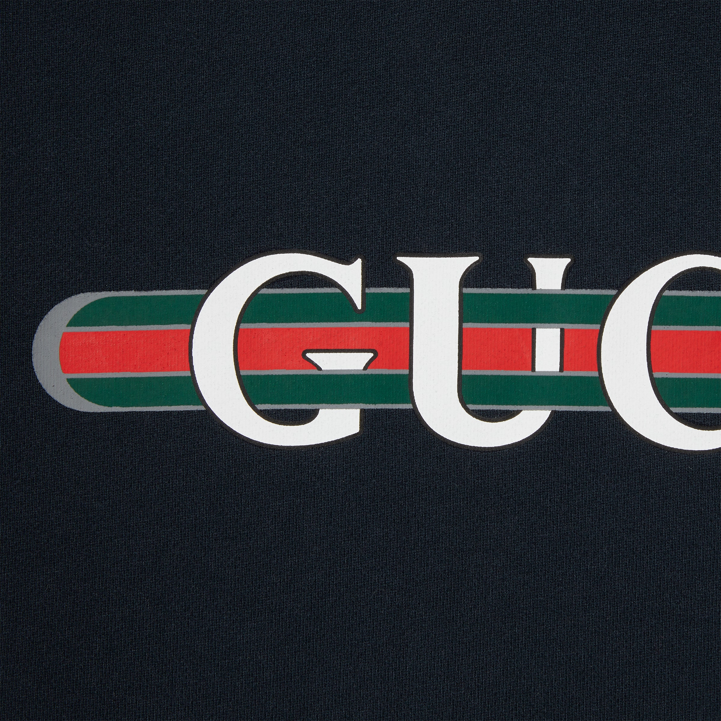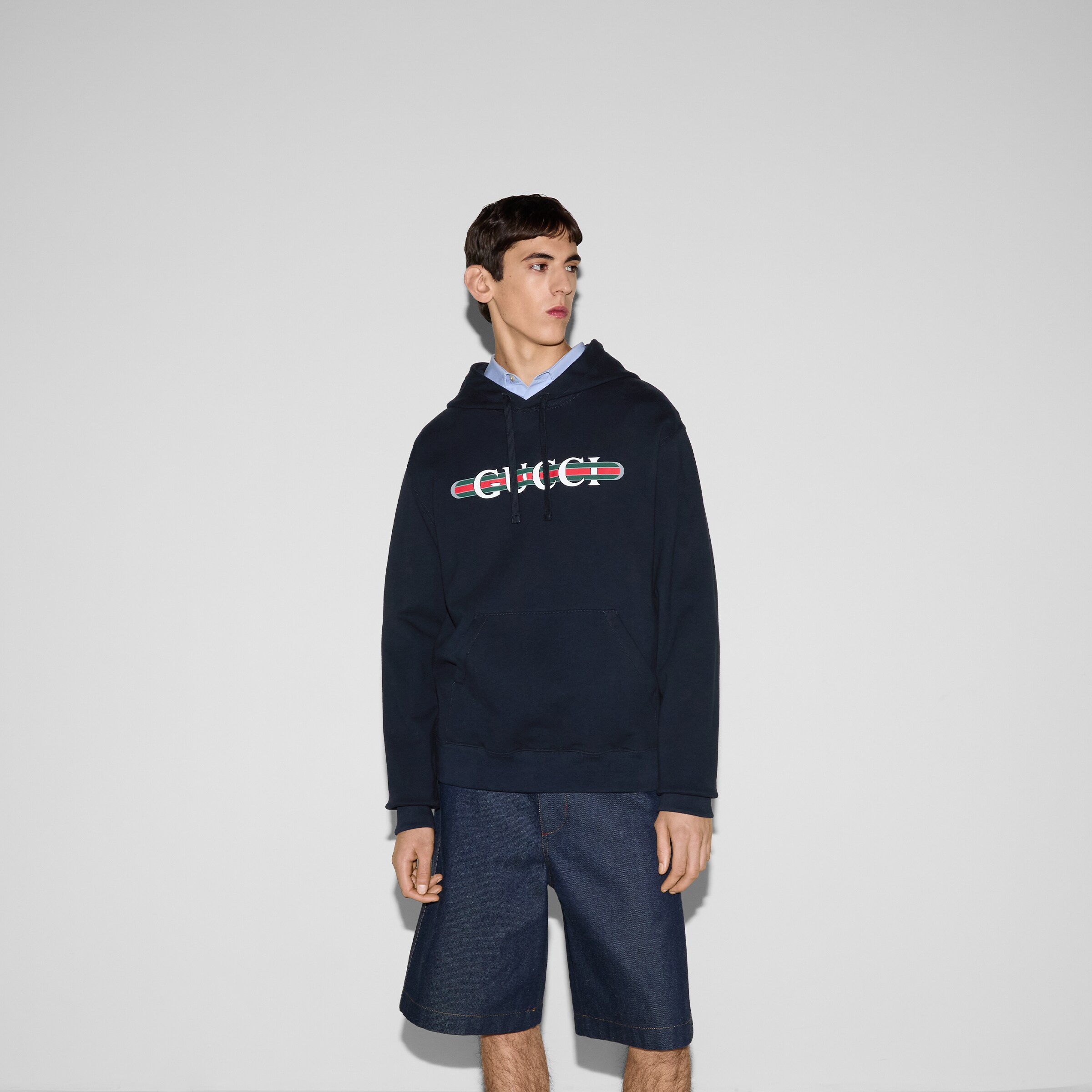今シーズンも進化を続けるブランドコードが、ジャージー素材のアイテムを彩ります。コットンジャージーで仕立てたこのレギュラーフィットのフード付きスウェットシャツには、GUCCI ウェブ ストライプ プリントをあしらいました。